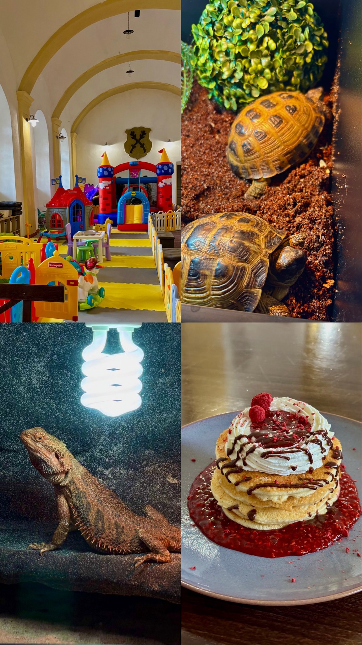 Kavárna je rozdělena na dvě části.První část kavárny je tvořena posezením a herničkou se skákacím hradem a množstvím hraček pro Vaše zvídavé děti. Druhá část kavárny je oddělena od herničky, aby byl zajištěn klid pro ty, kteří jej preferují.
